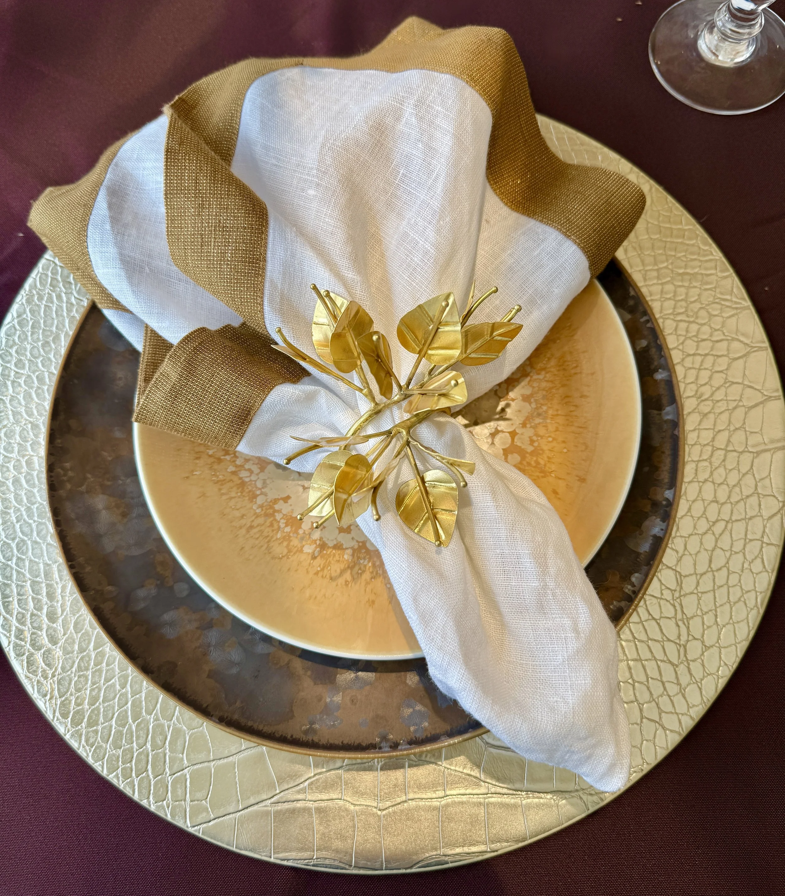 Never underestimate the power of a beautiful napkin and napkin ring! Luxurious fabric, a crisp fold, or embellished with creative greenery instantly creates a sense of occasion. Think of stylish napkin rings as jewelry for your table. (Do you go out to an event without jewelry? Your table shouldn’t either.) Use elegant napkins to reinforce your theme in either color or style. Napkins are a super simple yet impactful way to elevate your table and make guests feel pampered.